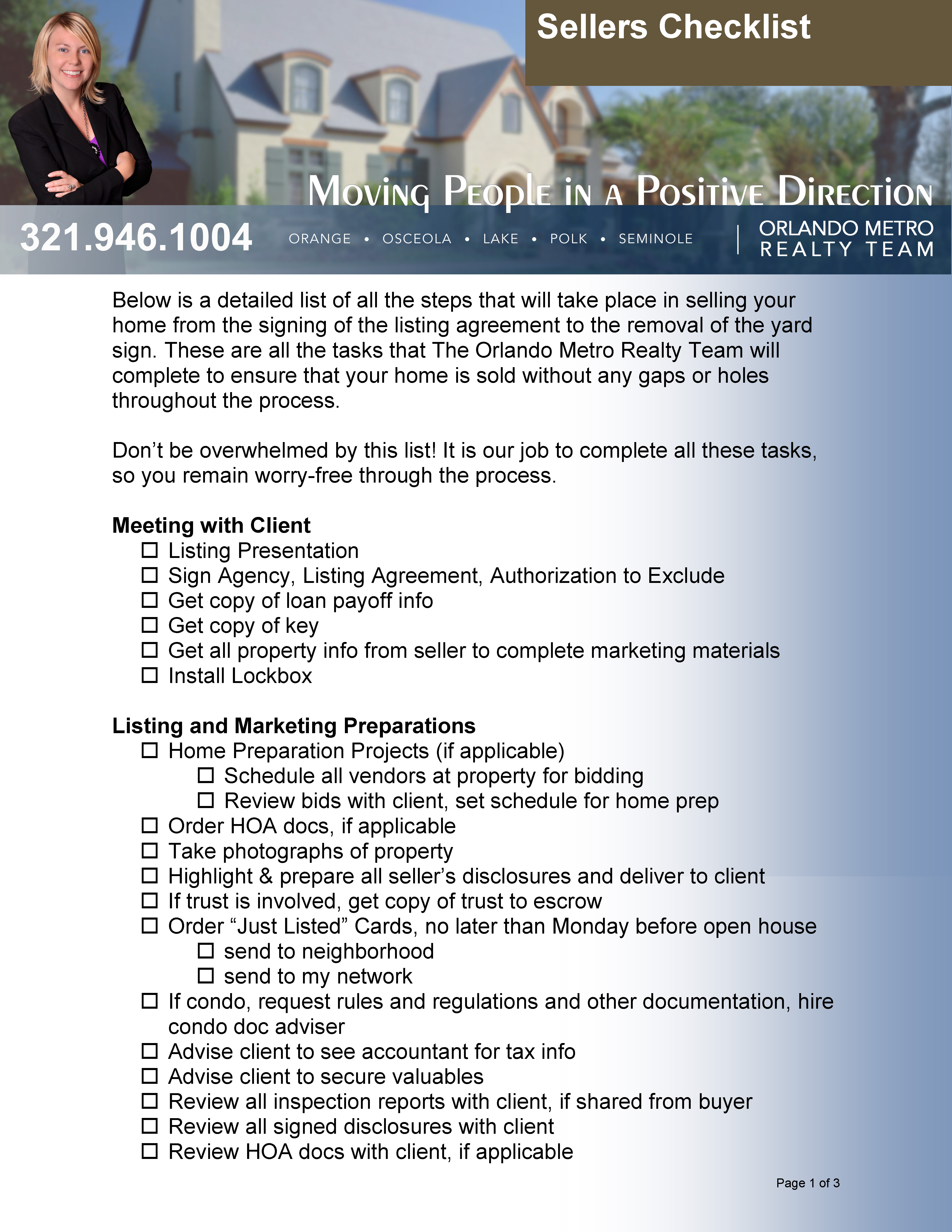 Below is a detailed list of all the steps that will take place in selling your home from the signing of the listing agreement to the removal of the yard sign. These are all the tasks that The Orlando Metro Realty Team will complete to ensure that your home is sold without any gaps or holes throughout the process.